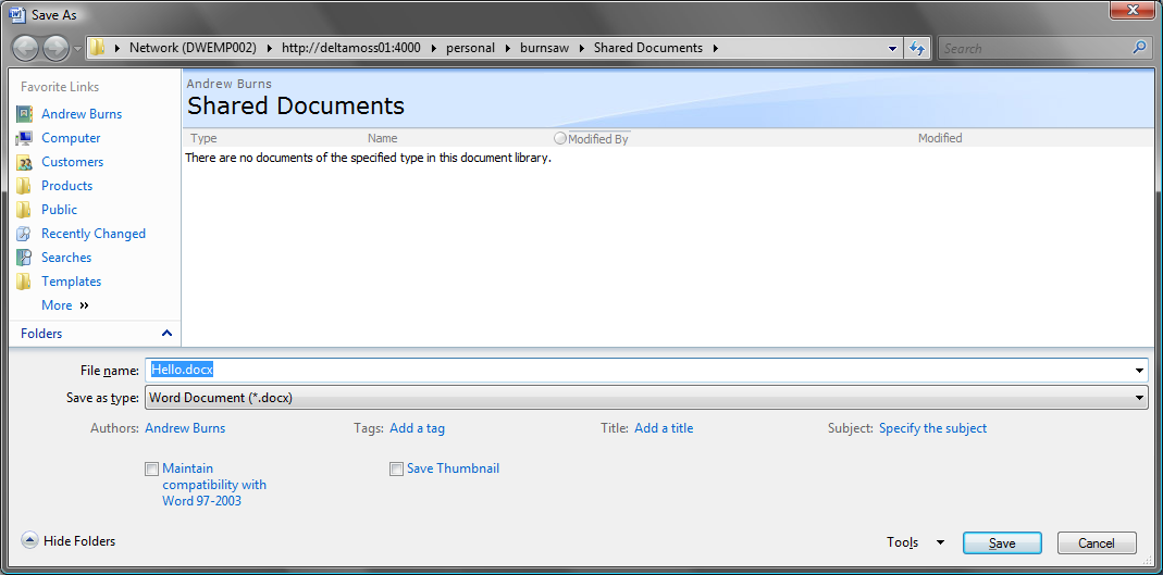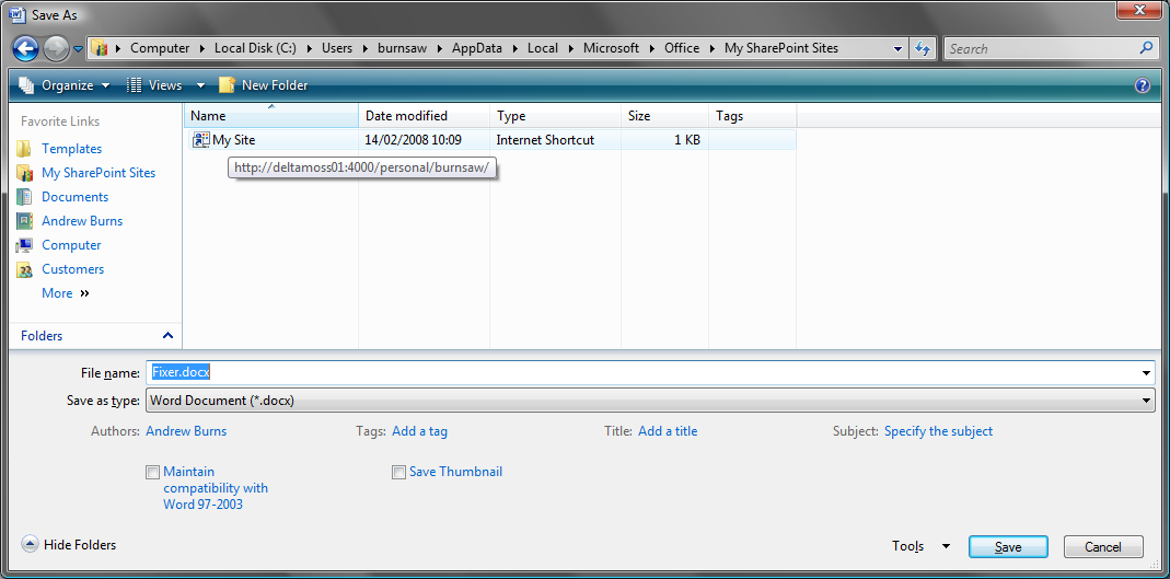 On it there is the ‘Favorite’ panel (UK English clearly doesn’t apply) and the option of ‘My SharePoint Sites’. Great! Wrong! If I click on the the ‘My Site’ shortcut, it changes the name of my document (‘fixer.docx’ in this case’), and if I double click, it tries to save the document as a file called .docx. The error I then get it ‘Word did not save the document.http://moss:4000/personal/burnsaw/.docx’.
