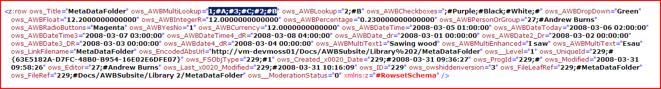 Secondly, AWBMultiLookup is a multi-select lookup column. In other words, it looks up data from another list, and you can can select zero to many items from it. For my folder, I’d selected 2 options from this column (‘A’ and ‘C’), and now I have 2 records with the only difference being the value of the AWBMultiLookup column – ‘A’ or ‘C’. On a hunch, I went and selected a third option (‘B’), and my XML I was getting back became: