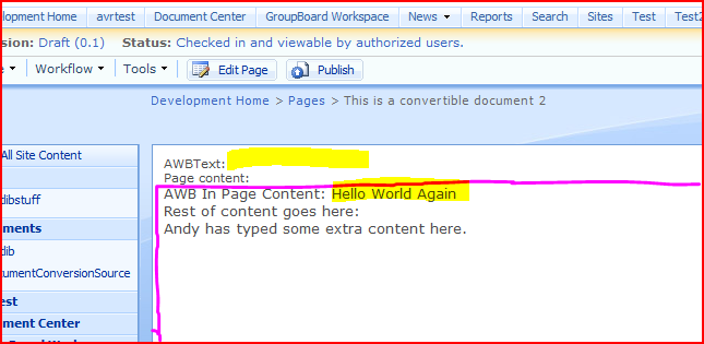 Okay, so I’ve scribbled on this a bit. The area outlined in the purple-pink colour is the content of our document that we converted. You can see that this includes the value of the ConvertableDocument‘s AWBText column. Hurrah! However, above this is the value of the AWBText column on the ConvertableDocumentPage – and it is still empty. In other words, the original document’s metadata is now in the page content – but it still isn’t stored against the Page as metadata. This isn’t really suitable for our customer – they need that column data against the Pages for their navigation. Bah!