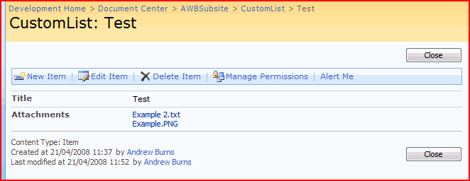 This shows two list items, one of which has attachments, one of which doesn’t. Indeed, the one with attachments has multiple attachments (a feature that I often forget!)