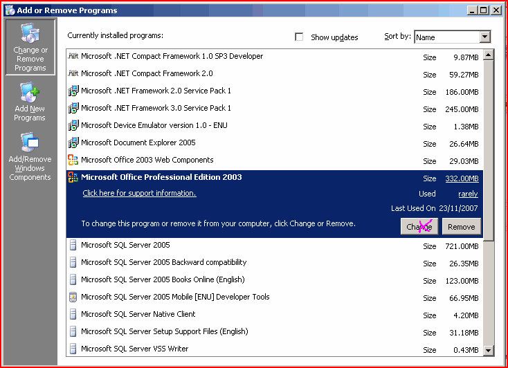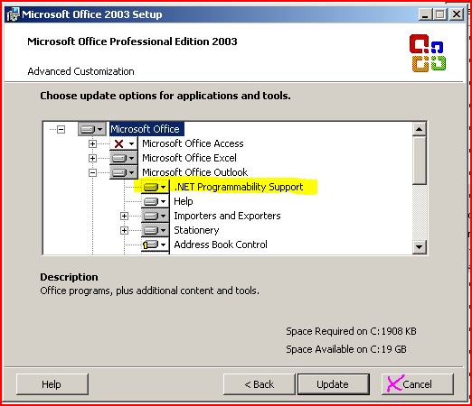 • Expand the Microsoft Office Outlook branch and look at the item .NET Programmability Support. A little hard disk icon means it’s installed, a red cross means it isn’t, and a hard disk with a ‘1’ means that it’s not installed, but will try to install it the first time it’s used. It should look something like this (although the yellowness is to highlight the setting):