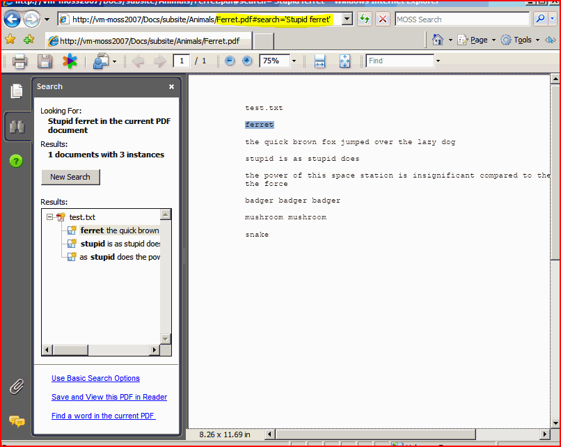 So, I’ve posting about some work I’ve been doing with SharePoint Search. Now, to pull it all together – I’ve been trying to do hit highlighting inside Adobe Reader, so if a user clicks on a search result Adobe Reader opens and automatically searches for occurances of the search term. Doing this requires knowing your file extension (so you only process PDFs this way), knowing the query string parameter for what is being searched for, and that you can pass parameters into Acrobat Reader. I’m not going to go too much into that last part, but you can find documentation about this on Adobe’s website (pdf).