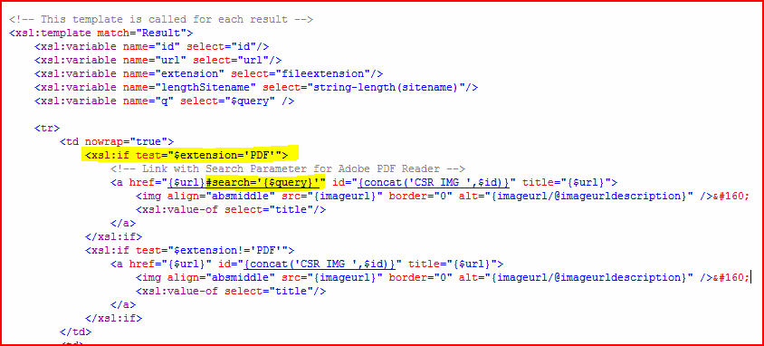So, what does this show? Firstly, you can see that the query string is being passed into our Search Core Results web part, as described previously. We’re also selecting the FileExtension column, also as described previously. Our XSL looks to see if the extension is PDF, and if so it emits the url to the item plus:
