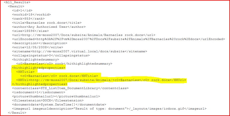 You can see that in this case it has picked up the terms to be highlighted in the title, and has given it a surrounding <c0>..</c0> tag. Digging on through this I found that filenames that had the search term immediately before their ‘dot-extension’ would not highlight correctly. If there was a space before the dot-extension, though, they would.