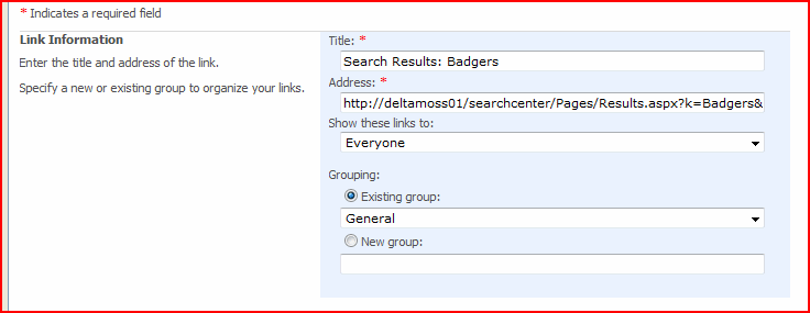 So there we’ve got one way of saving a search in SharePoint. In reality, there are a lot of alternative – Links lists being an obvious choice, but there are things like summary web parts too. Really, it’s anywhere you can store a URL.