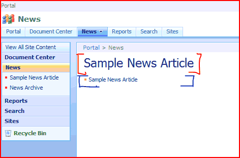 I’ve bracketed both the web parts being used with red and blue – otherwise it’s not clear that there are two web parts doing content roll-up here – one for the most recent headline, and another to show a list of recent News items.