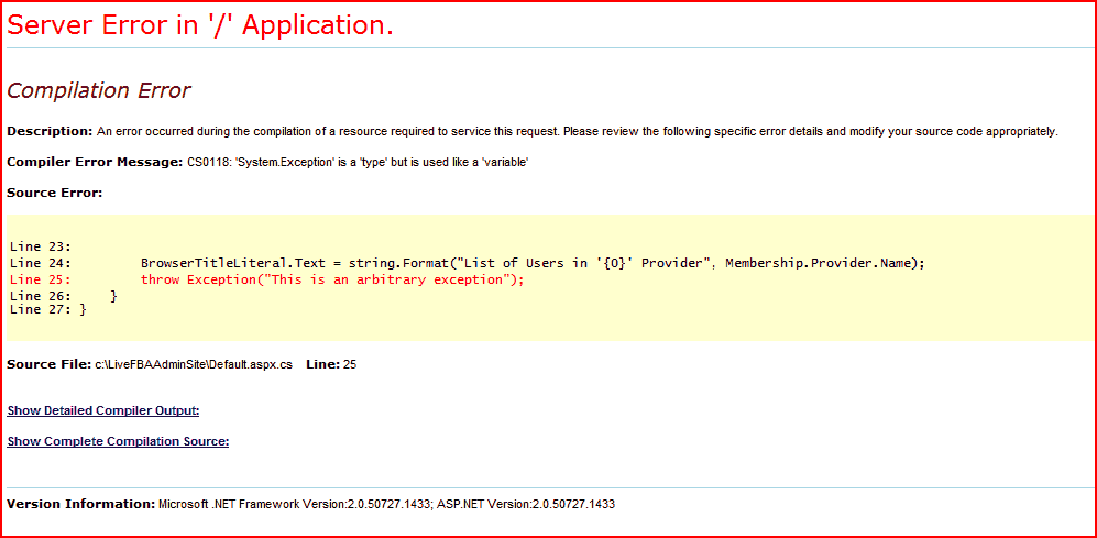 ASP.NET applications can have custom error pages for the different HTTP responses. For example, you can have a custom “404 – Page not found”. Now, this can be a good idea, particularly for errors that produce stack traces or provide potentially sensitive information about the workings of your code. Or, heck, maybe you just want to present a nice looking error page.