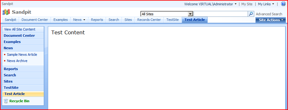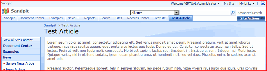 Hmm. Nearly there – but the border isn’t right. There should be a 1pixel blue border at the top and left of the main content area. How does SharePoint normally do that?