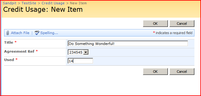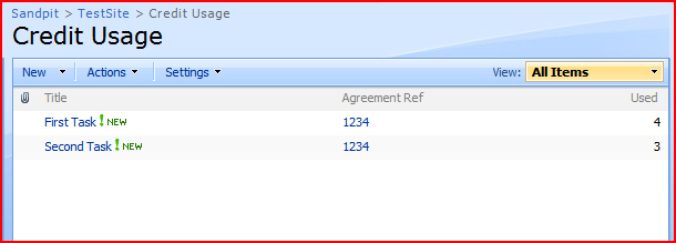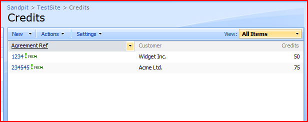 Notice that the Agreement Ref column is a lookup column against Agreement Reference in the ‘Credits’ list.