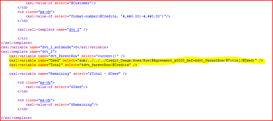 • I changed the XSL template for the subview body. Instead of calling a template for each row, I created two XSL variables – for the number of credits in the pool, and to calculate the number used (highlighted in yellow)