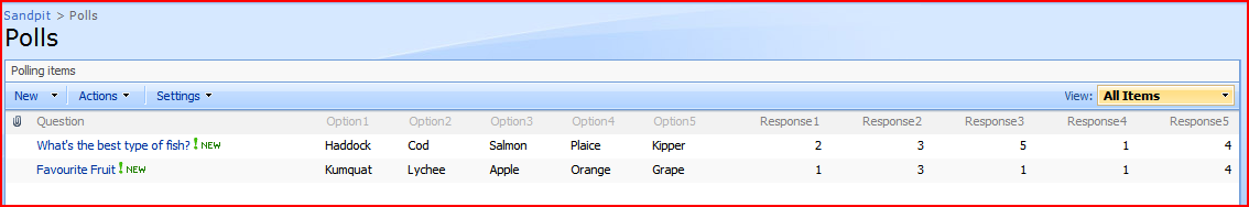 Hmm. So how does it store it’s data? Well, that seems to me a little strange – each poll, options and responses are a single row in a list: