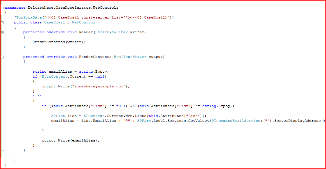 To do this, first I needed to get the email address of my list. The first part of that (before the ‘@’ ) is easy enough – it’s a property of an SPList item. But I needed to get the rest of the address, and to output it in my page as a string. I ended up writing a custom Web Control: