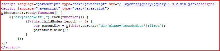 What this code does is get the innermost DIV tag of every bordered area. If that DIV tag doesn’t have any children, we find the first parent DIV tag at the ‘top’ of my set of nested DIVs, and hide it! And that works nicely: