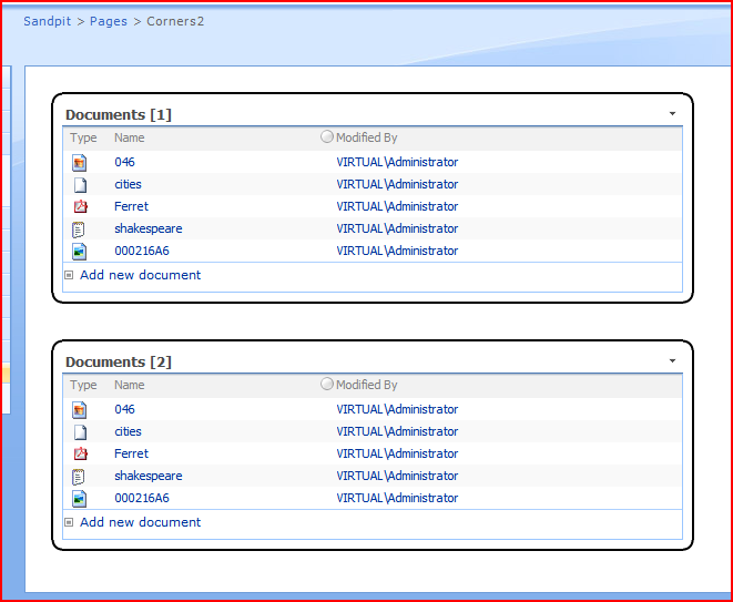 The Holy Grail of SharePoint branding – at least as far as I’m concerned – is rounded corners on Web Parts. Every design that comes in has this at first. As mentioned yesterday there are examples of doing this for the web part’s title – I’ve done this using Madalina’s instructions and Heather Solomon has some instructions too.