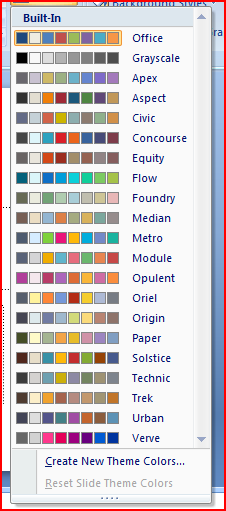 Themes in SharePoint 2010 are, well, really quite neat. The branding itself is made up of images and CSS – no surprise there. However, you can ‘annotate’ your CSS so that particular colours can be replaced by your theme. The colour schemes themeselves are defined in PowerPoint. Yes, PowerPoint. I was suspicious, but works pretty well. (You can also use SharePoint Designer too – see below). There are the built in ones: