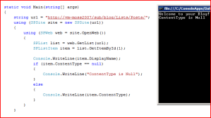 I was running this code in a console application on the server. The URL is to a Blog Post library in a Blog site. When run, the output was: