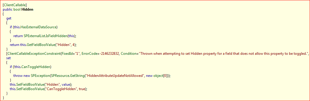 How to deal with this? Well, there is a clue in the Reflector output – curiously, for no logical reason I can see, at the end of the Hidden property setter it also sets CanToggleHidden property to true (which is pointless; you’ll never run that line unless the property is already true):