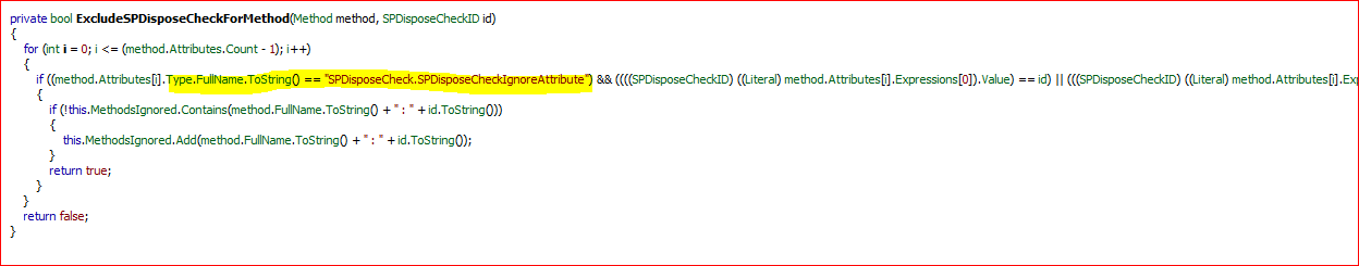 The definition of this attribute is in the documentation in the SPDisposeCheck solution, and you can read more about it here. It’s neat – it gives use a way to get to a ‘clean’ bill of health after each compile, by ignoring possible problems that we’ve investigated. Or does it?