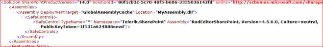 WTF? As best as I can determine, the assembly information in my SafeControls entry in my solution’s manifest has been ignored. The entry in the manifest lives within a particular Assembly element, so presumably SharePoint itself chooses to read the information from the assembly, rather than the manifest! (Why ask for the information then?)