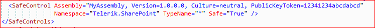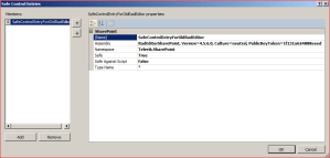 Conclusion: If your WSP doesn’t contain the assembly you’re trying to create a SafeControl entry for, you’ll probably need to use an SPWebConfigModification. That seems a shame, given that Visual Studio 2010 appears to let you create other Safe Control entries, and puts them into the manifest correctly.