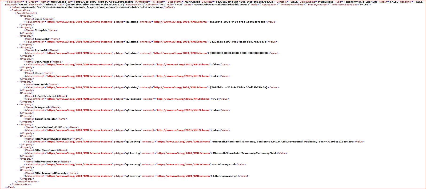 In Part 1 I looked at the structure of our Taxonomy field – which is in fact two fields. We also saw how the TaxonomyField definition has an array of properties related to it too. As a reminder, here’s a screenshot of the XML for it: