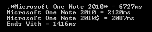 Out of interest what happens if you add an end of string marker to the regex (ie. new Regex(@”Microsoft One Note 2010$”) – is there still a performance gain when using string.endswith()?
