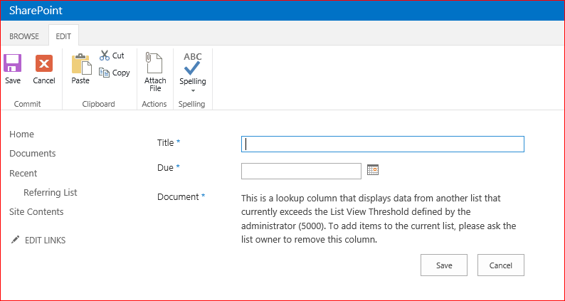 So, I had an issue that I’ve a customer who wanted to have some items look up against a large list. (In fact, it was a large document library). This large list had more than 5000 items. This is a little unfortunate, due to a painful and annoying quirk in SharePoint’s design.