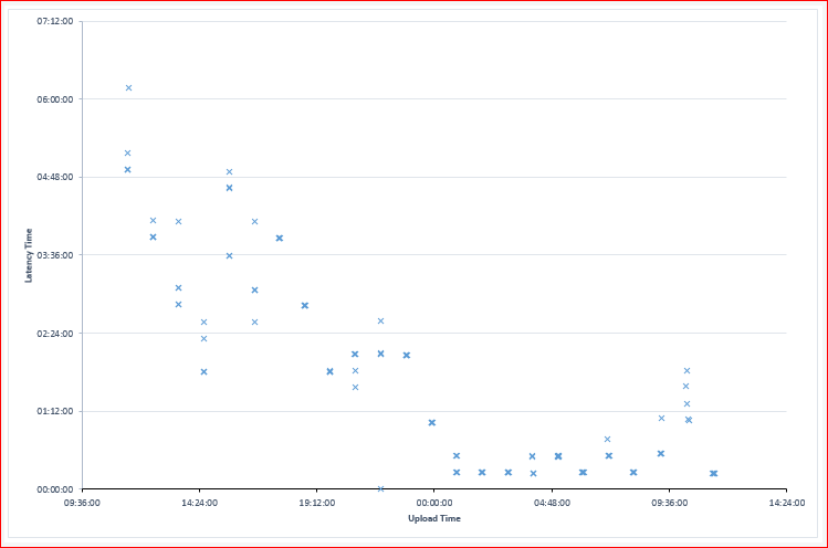 I also drew up a chart of upload time of day vs how long indexing took. This chart only shows the results from our company tenant.