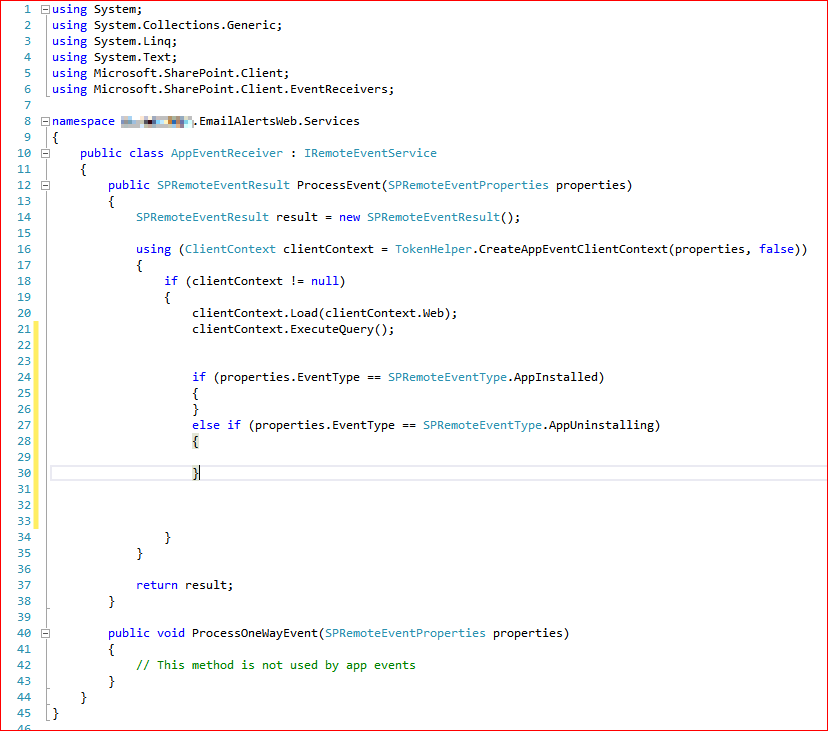 Once you’ve turned on handling for an app event then Visual Studio adds an ‘AppEventReceiver.svc’ service to your ASP website, and opens a class file for you to handle the event. Note that all events are handled by the ‘ProcessEvent’ method, so you’ll need to determine the type of the event yourself…