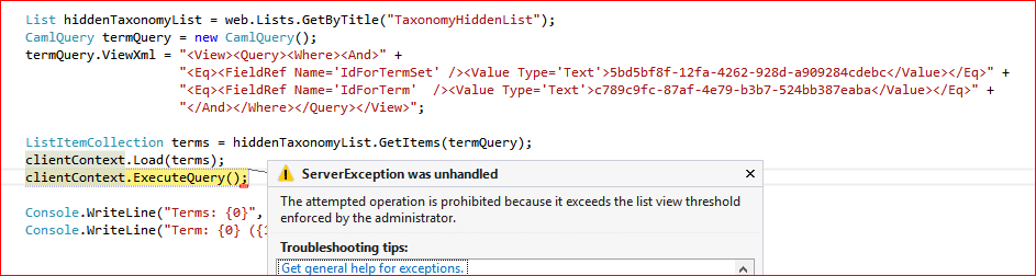 What I needed to do in some Client Side Object Model (CSOM) code I was writing recently was, given a Term‘s details, I needed to query for that term being referred to in a large list (5000+ items). I could have tried something like: