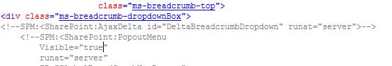 First, edit the master page in SharePoint Designer or Design Manager. I’ve used Design Manager here, and I’ve found the section of the page about Breadcrumbs. You’ll notice that it’s hidden, and the breadcrumb control is hidden: