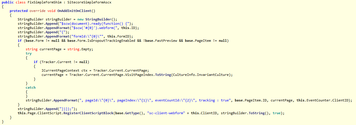 I realised after a while that Googlebot is a robot, and so is excluded from analytics, so this problem probably had the same cause as the exceptions our testing was starting to throw up. The OnAddInitOnClient method isn’t one of mine, though – it’s part of Sitecore’s Web forms for Marketers – so I opened up Reflector and down the rabbit hole I went…