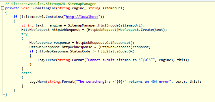 This struck me as interesting. These are calls to different search providers to tell them that your site’s sitemap file has been updated, and should be read again (so that new content could be indexed). This is all from a nice little module on Sitecore Marketplace. We use it quite a lot. However, I spotted a few issues…