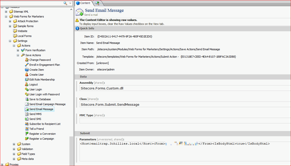 Hmm, quite. So I decided to give it it a go. I deleted the mail server settings highlighted in the text above, put that into the raw values, published, and retested my form. It worked nicely – now my email was going to the mail-trap.