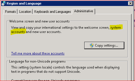 I’d rather that I was using ApplicationPoolIdentity, but I was told to use Network Service for other reasons. Anyway, the question then became “How do I set the Locale for the Network Service account“? It took a bit of digging, but under Control Panel > Regions and Language > Administrative Tab it does mention setting the System Account locale settings: