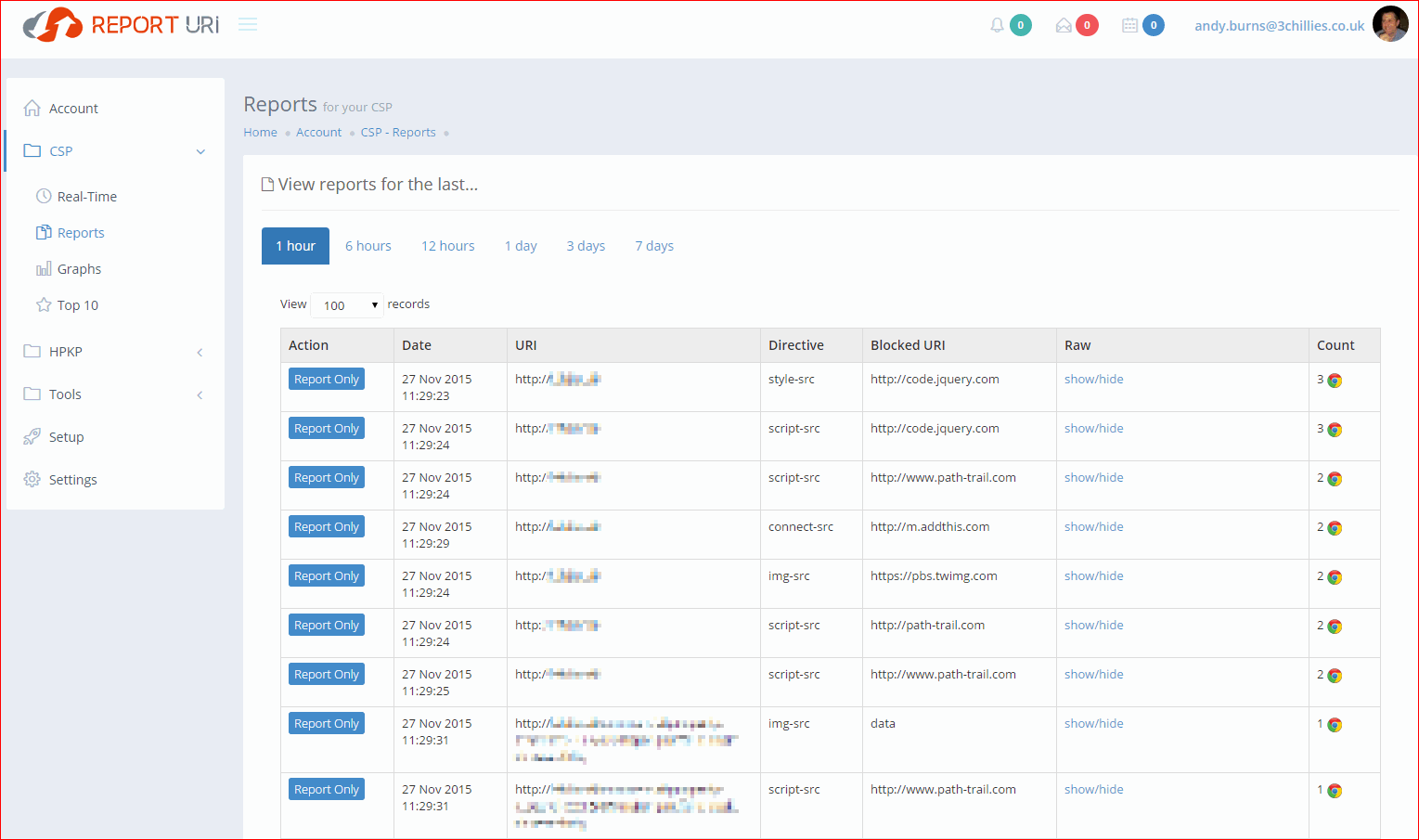 Nice. But I really don’t want to have to trawl through my site looking for violates – there could be thousands of pages. Well, they thought of that too. One of the settings in the CSP is the report-uri setting. This tells the browser to send a report of violations to a suitable service – like report-uri.io. This is another Scott Helme site, and I love it. I mean, it isn’t a revolutionary idea – it’s just fantastically simple and easy to use: