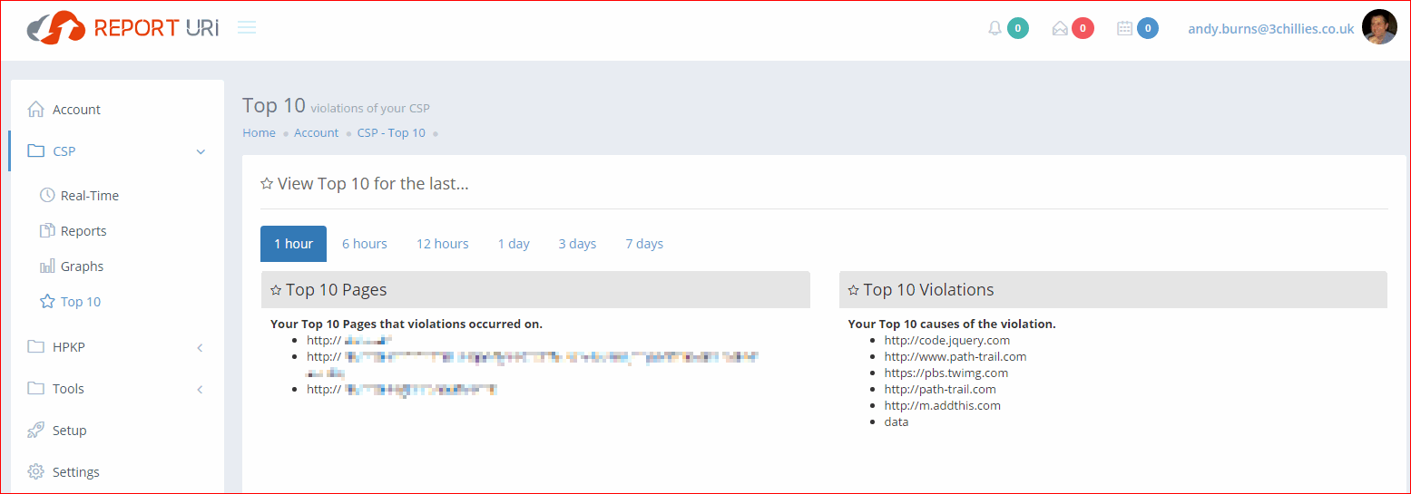 Look, a report of my violations! With a count! And a time-window! Or we can have a top 10 report of violating pages, and things that are violating:
