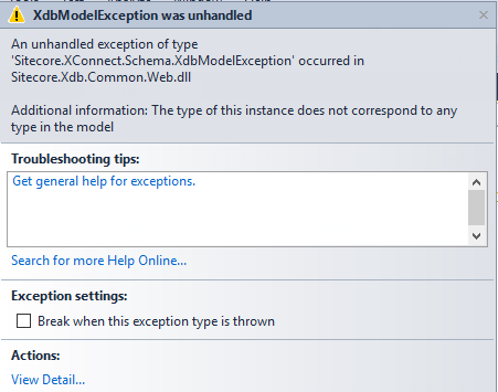 An unhandled exception of type ‘Sitecore.XConnect.Schema.XdbModelException’ occurred … The type of this instance does not correspond to any type in the model