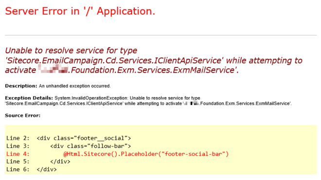 [InvalidOperationException: Unable to resolve service for type 'Sitecore.EmailCampaign.Cd.Services.IClientApiService' while attempting to activate 'XXXXXXXX.Foundation.Exm.Services.ExmMailService'.]