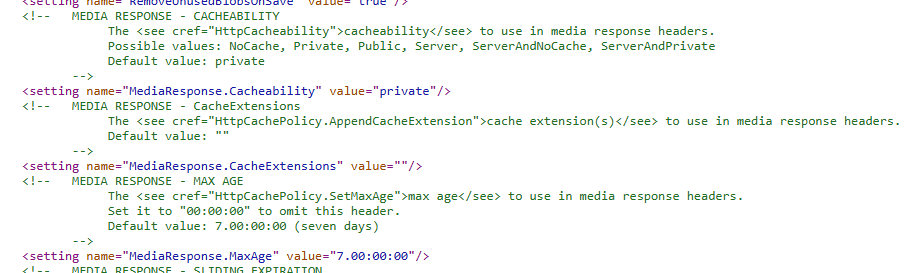 So, it’s not a shock that it doesn’t. But what sets this? Well, in the Sitecore settings we have MediaResponse.Cacheability and MediaResponse.MaxAge settings: