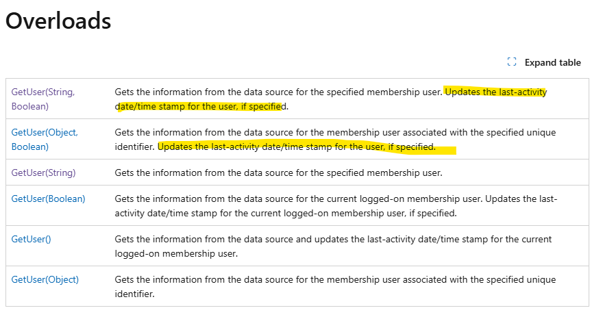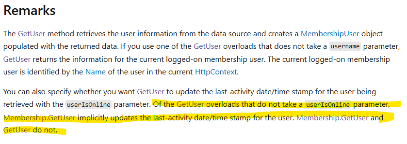 Okay, there’s a documentation fail for Microsoft there – it’s completely impossible to see which overloads it’s talking about at the end. But I think it’s pretty clear that whatever one Sitecore is using, it’s updating the LastActivityDate.