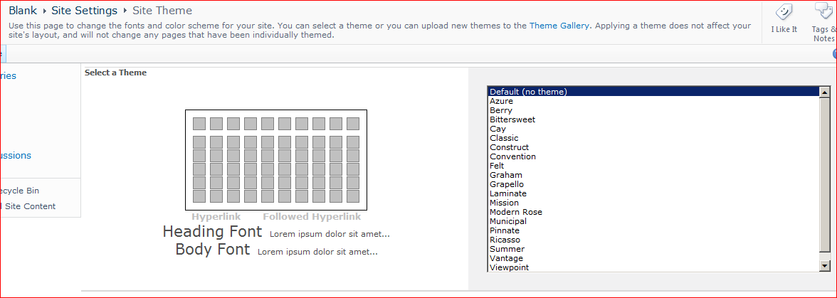 That’s the second tip of hers I’ve found on Google and used in the last 2 weeks. Maybe I should start watching that blog. Anyway, I guess that ‘none’ makes sense when you look in 12/TEMPLATES/LAYOUTS/1033/SPTHEMES.xml – the default theme has a TemplateID of ‘none’.